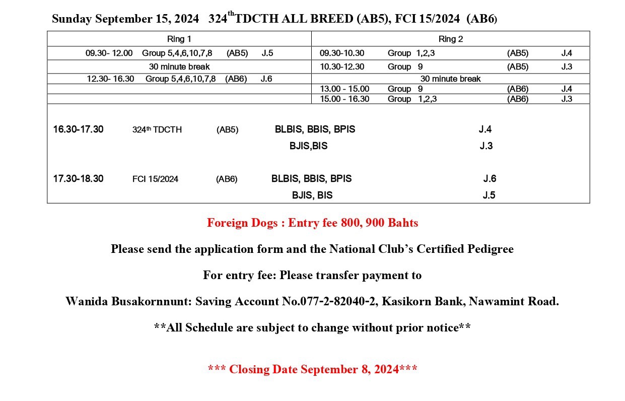 1. สุนัขที่ประกวดต้องขึ้นทะเบียนกับทางสมาคมพัฒนาพันธุ์สุนัข (ประเทศไทย) และฝังไมโครชิพทุกตัว แล้วเท่านั้น
